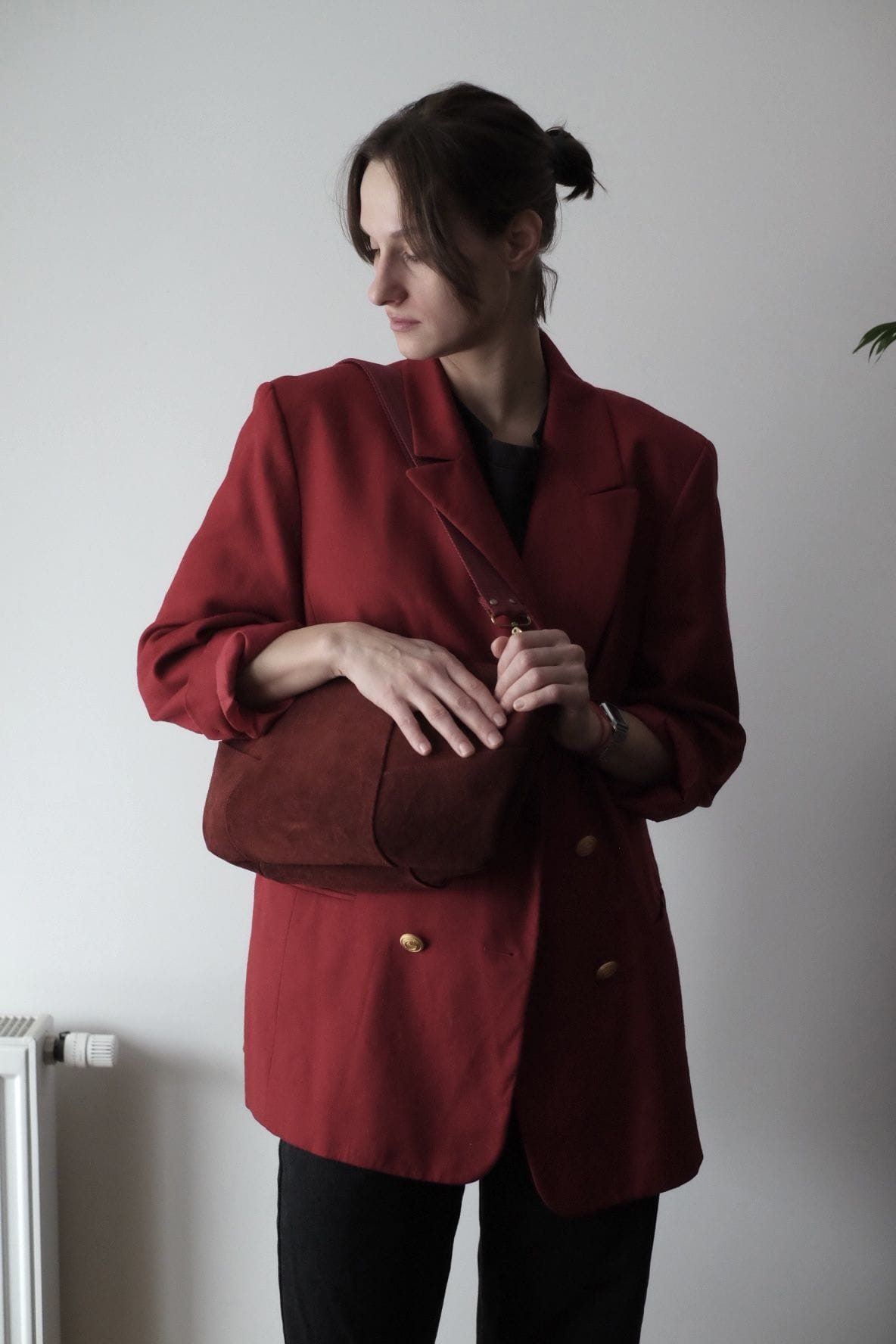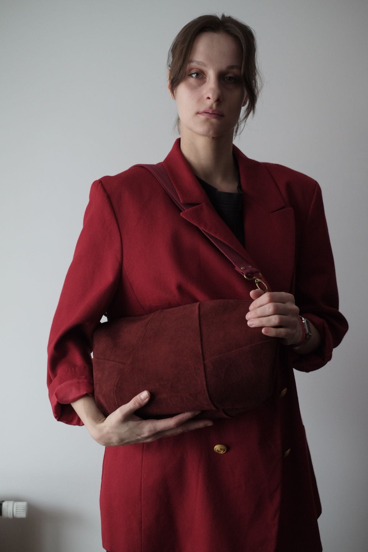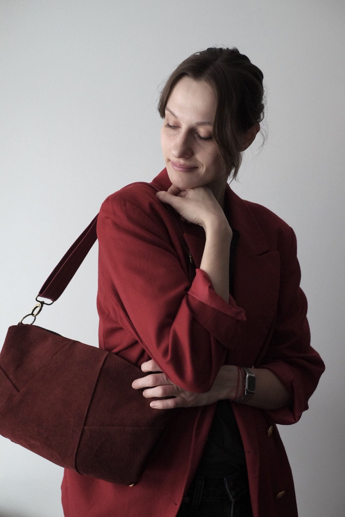 To jedna z serii naszych patchworkowych toreb MAXI w jednolitej tonacji kolorystycznej. Model Suede Wine łączy kawałki naturalnego zamszu w intensywnym, winnym odcieniu bordo. Kolor jest głęboki, nasycony i elegancki – w zależności od światła może wydawać się bardziej bordowy lub wpadający w ciemne czerwone wino. Charakterystyczna, miękka struktura zamszu nadaje torbie szlachetności i sprawia, że kolor zyskuje dodatkową głębię.